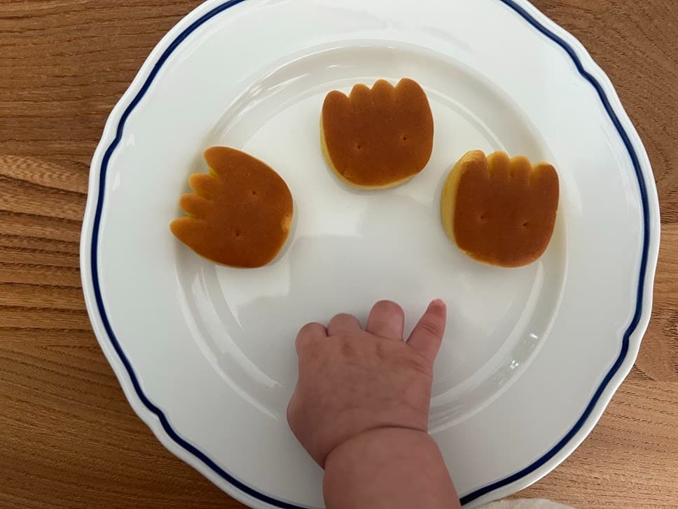 お子様用の「やさいパン」と商品が赤ちゃんの手に似ているということで、写真をとって親がむふむふするというのがベビー界隈での定番らしいので、我が家もやってみました。むふむふ。